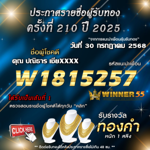 ประกาศรายชื่อผู้โชคดี ณิชาพา พร้าxxxx ได้รับทองคำหนัก 1 สลึง ประจำวันที่ 08 ธันวาคม 2568