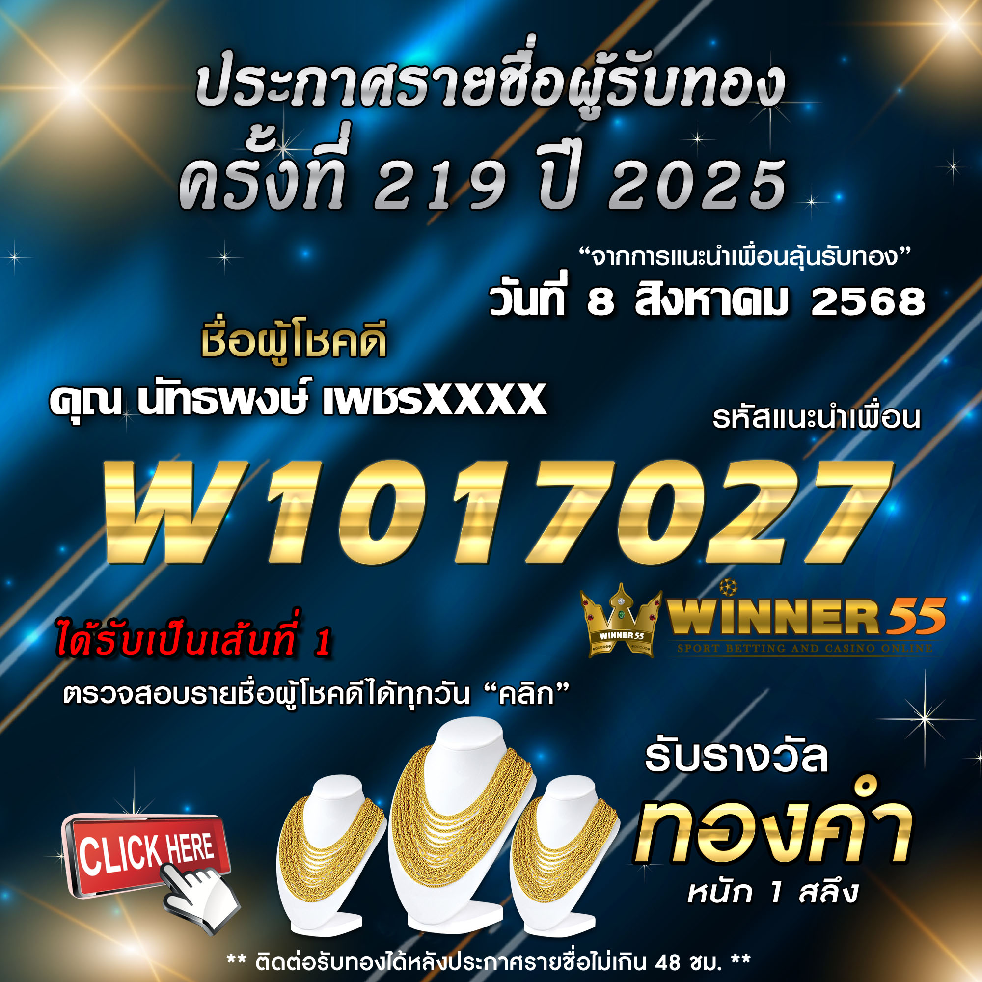 ประกาศรายชื่อผู้โชคดี คุณ นัทธพงษ์ เพชรxxxx ได้รับทองคำหนัก 1 สลึง ประจำวันที่ 08 สิงหาคม 2568 08/08/2025