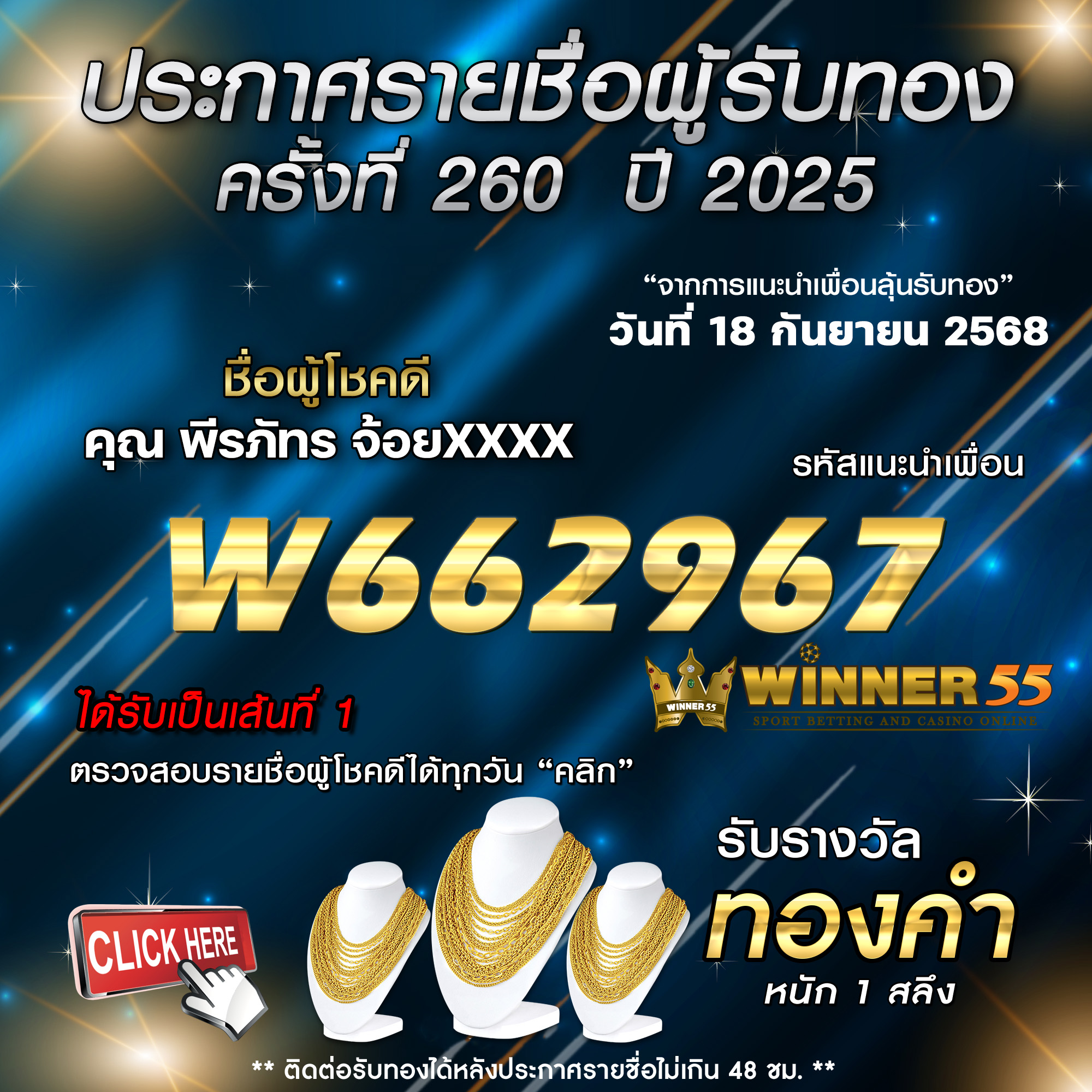 ประกาศรายชื่อผู้โชคดี พีรวัชร มิ่งxxxx ได้รับทองคำหนัก 1 สลึง ประจำวันที่ 16 กันยายน 2568