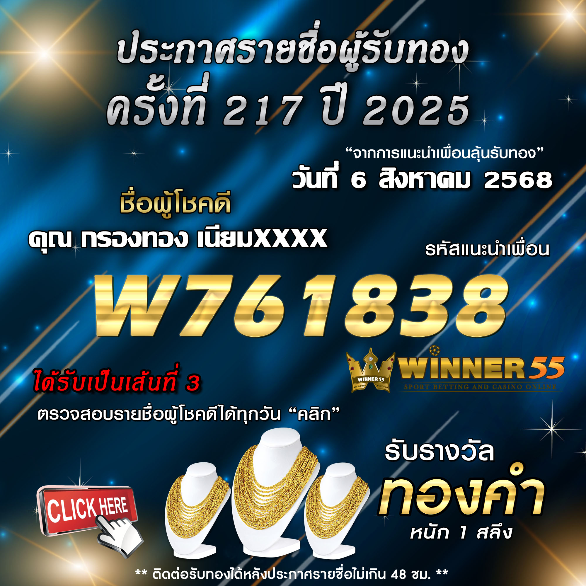 ประกาศรายชื่อผู้โชคดี คุณ วรพงษ์ ไกรxxxx ได้รับทองคำหนัก 1 สลึง ประจำวันที่ 07 สิงหาคม 2568