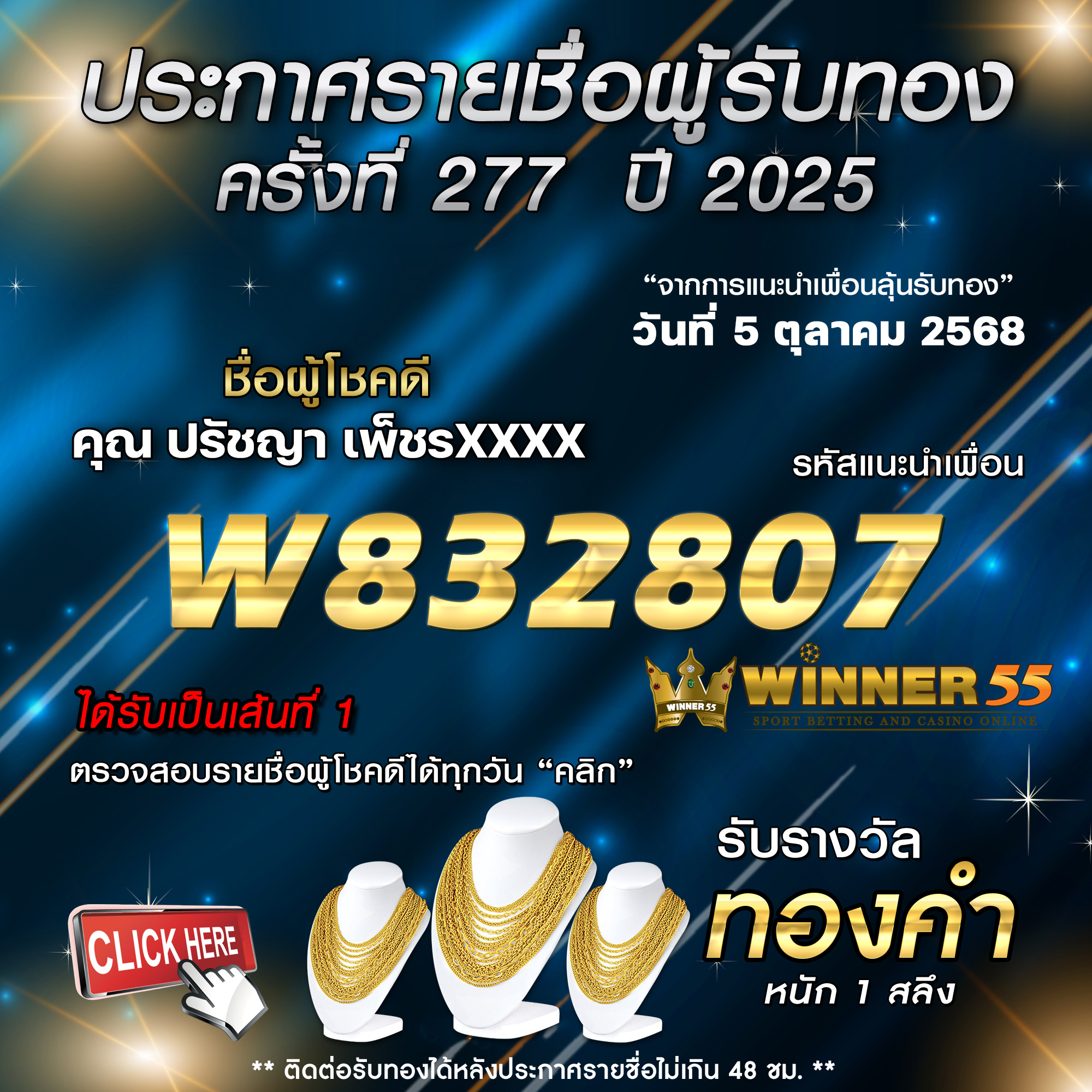 ประกาศรายชื่อผู้โชคดี วิระศักดิ์ จำxxxx ได้รับทองคำหนัก 1 สลึง ประจำวันที่ 07 ตุลาคม 2568