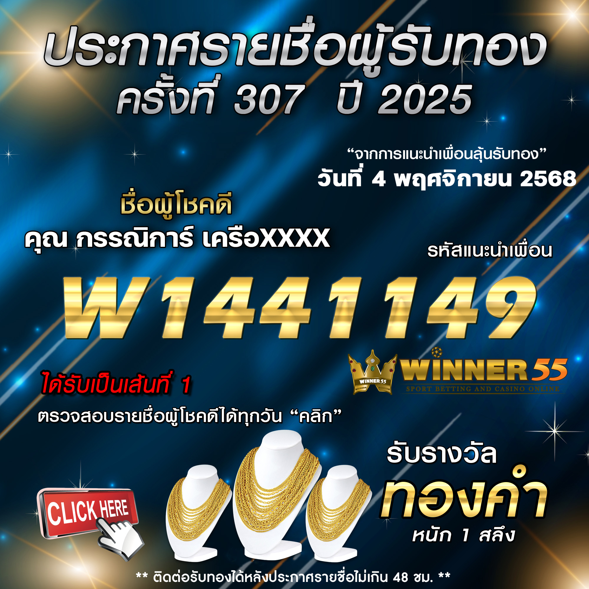 ประกาศรายชื่อผู้โชคดี กรรณิการ์ เครือxxxx ได้รับทองคำหนัก 1 สลึง ประจำวันที่ 04 พฤศจิกายน 2568